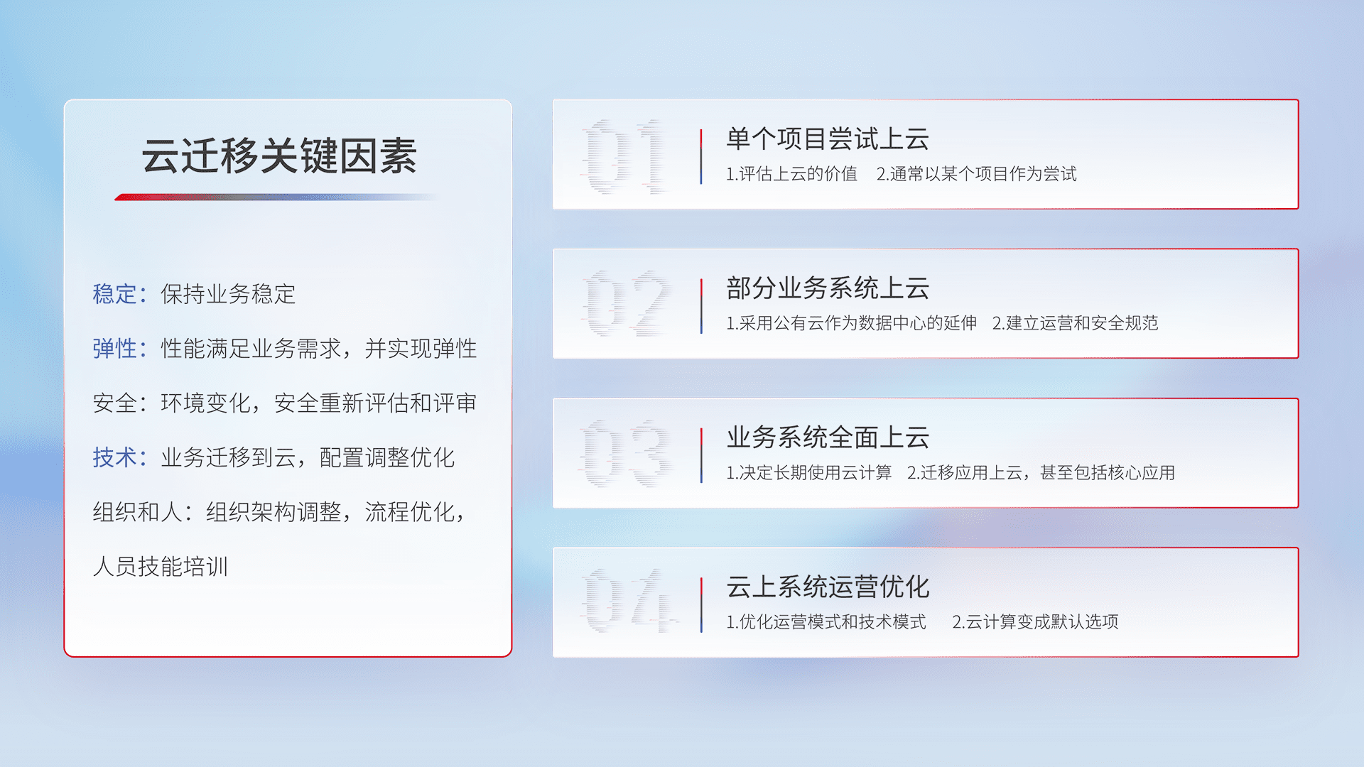 结合实际业务,,从规划设计、、、云平台选型、、、云原生改造、、数据迁移、、集成交付,,,迁移全过程为客户识别最佳上云路径,,做好风险识别管理,,设计网络架构、、、、身份权限、、、、安全审计合规、、、操作审计、、、、日志审计、、、监控告警策略、、多站点容灾设计等,,,对云上基础设施进行整体规划,,,,提升IT治理水平,,,,以满足弹性、、、、高可用、、、高性能的需求。。。。